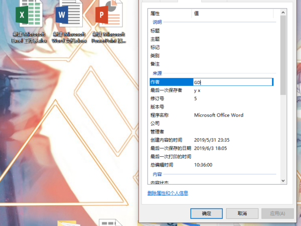 4、点击进入“属性”将“作者”后面的内容更改为需要的内容,保存该文档即可完成修改。