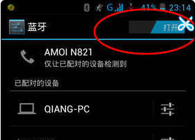 2.打开手机的蓝牙,同时打开另一部手机的蓝牙,用要传文件的手机蓝牙搜索另外手机的蓝牙。