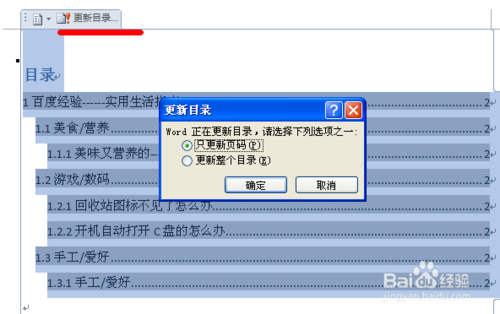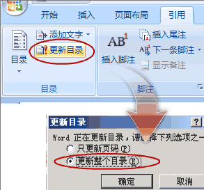 3、更新一下:引用 -> 更新目录 -> 更新整个目录 -> 确定即可完成自动生成目录。