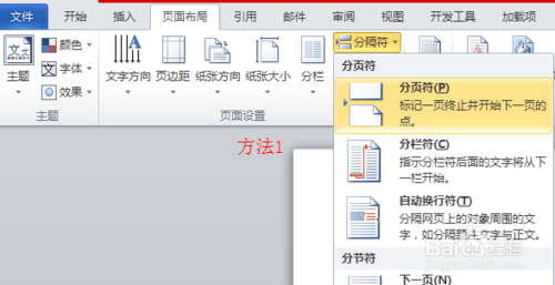 方法1:选择“页面布局”-“分隔符”-“分页符”
