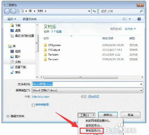 2、在“另存为”对话框中单击下面的“工具”按钮,在下拉菜单中选择“常规选项”;