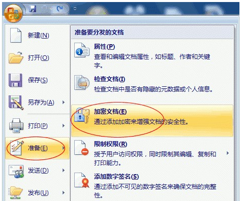 步骤1:安装2007版本Word,打开需要加密的文件,在Office按钮处,单击“准备——加密文档”选项。