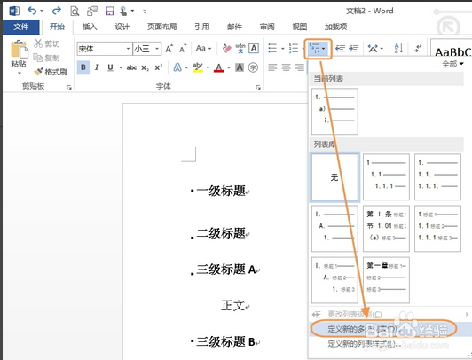 6、下面就将标题设置成标准格式。在“开始”选项卡,单击多级标签按钮(如下图所 示),在打开的界面中选择“定义新的多级列表”。