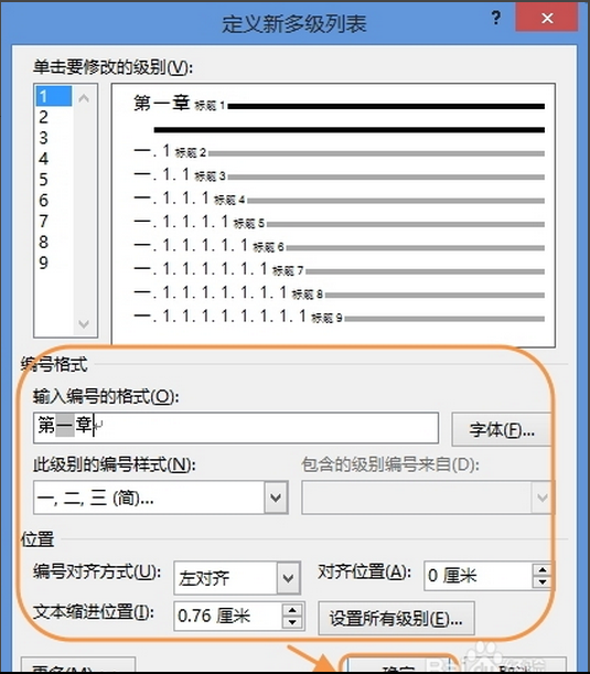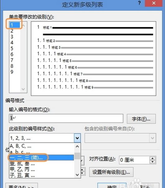 7、打开“定义新多级列表”对话框,为级别选择合适的编号样式。
