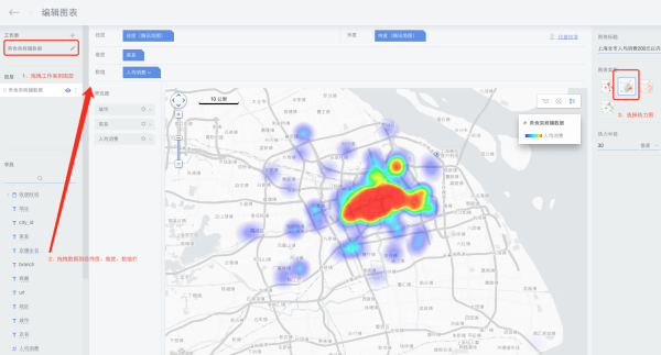 2)拖拽成图:先拖拽工作表至图层,再拖拽经纬度、维度数值,然后选择热力图即可;