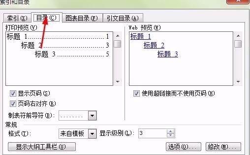 3.在对话框中单击“目录”选项卡,进行相关设置,如图所示,单击“确定”按钮,文章的目录自动生成完成。