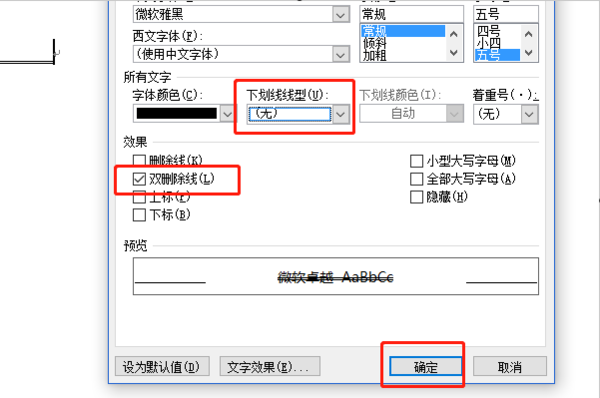 4、在弹出框里,下划线线型选择无,然后左边效果那里的双删除线前面打勾,再点击下面的确定;