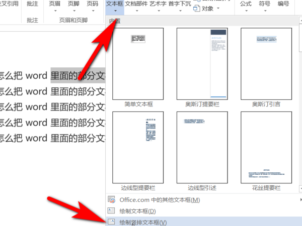 4、在插入工具栏下选择文本框工具,单击选择,在展开的内容栏中选择绘制竖排文本框,单击确认完成。
