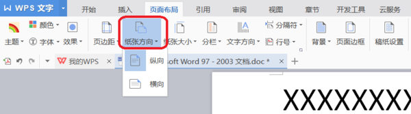 2. 在页面布局选项中选择纸张方向,这里可以选择纵向或者横向,即可将纸张变为需要的方向。这样会将文档中所有的页都变为同一个方向。