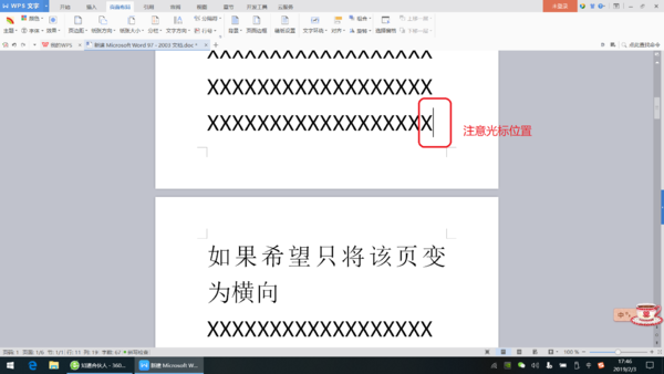 4. 如果需要将某一页之后的文档变为横向,先将光标放在前一页末尾的位置。