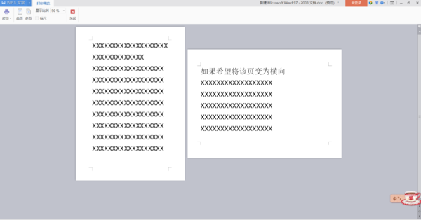 3. 以都变为横向为例,选择后文档就全部变为横向。下图为打印预览模式效果。