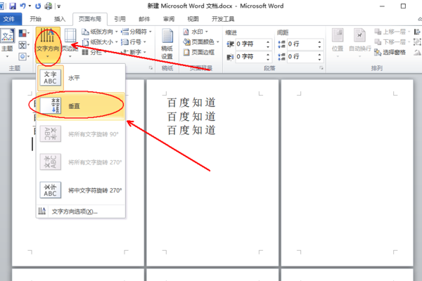 4、在下拉栏里有常见的文字方向,如果是想要应用于整个文档,点击相应的文字方向就可以了