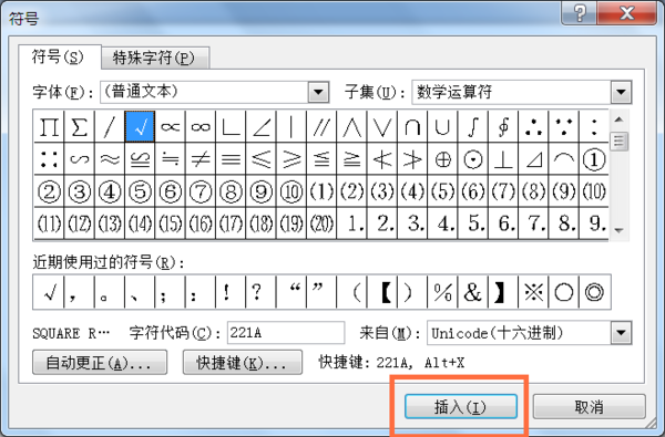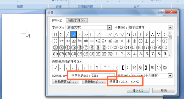 键盘输入特殊符号的快捷键是AIT+X组合键,但输入不同的特殊符号需要不同的字符代码,比如输入√符号,在word文档中按下221A+AIT+X,如图;