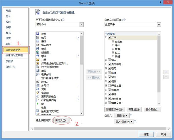 第二步:如图,类别切换至”自定义功能区“,单击”键盘快捷方式“右面的”自定义“按钮,打开”自定义键盘“对话框。