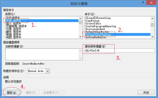 第三步:如图所示,类别点选”开始 选项卡“,命令点选”DefaultCharShading“,按新快捷键”Alt+Ctrl+D“,再单击”指派“按钮,单击关闭/确定按钮,关闭所有对话框。