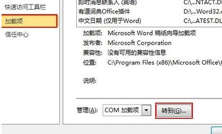 2、选择左侧菜单的加载项,点击转到按钮进入。