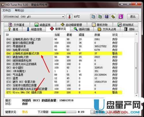 4、可以发现我的硬盘出现了一点小毛病,在黄色区域标识的地方就是硬盘的问题描述,点击其中一个选项后会在软件的下方给出详细的提示。可以对自己的硬盘状况有一个大致的了解。