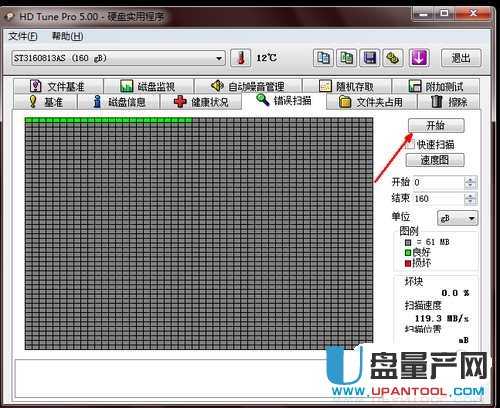 5、如果你想查出这些问题并作有针对性地修复,你可以点击错误扫描这个选项卡,然后点击开始按钮开始查找磁盘的错误,当查出错误的时候你可以根据你硬盘的状况来选项修复的方法。