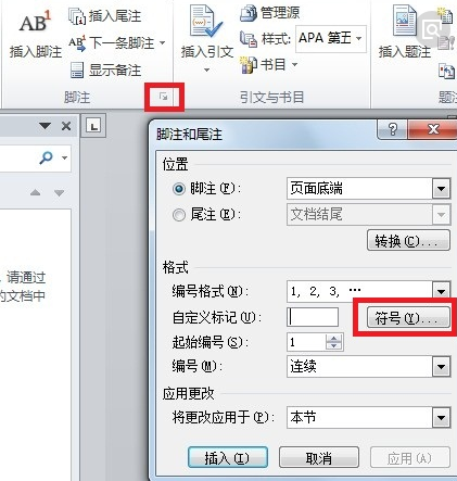 4、如果要自定义脚注的引用标记,可以选择【自定义 标记】,然后在后面的文本框中输入作为脚注的引用符号。 如果键盘上没有这种符号,可以单击【符号】按钮,从【符号】对话框中选择一个合适的符号作为脚注即可。