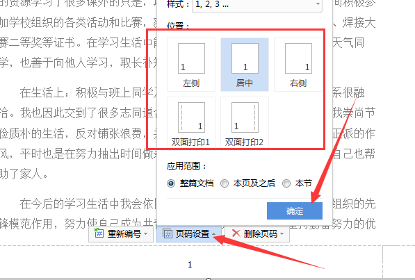 4、在任意页面的末端,点击页面中的页码设置选项,打开页码设置菜单,选择合适的页码格式,并点击确定选项。