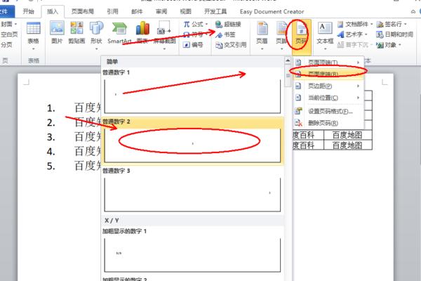 2、找到并点击【页码】-【底端页码】,然后挑选一个页码样式插入。