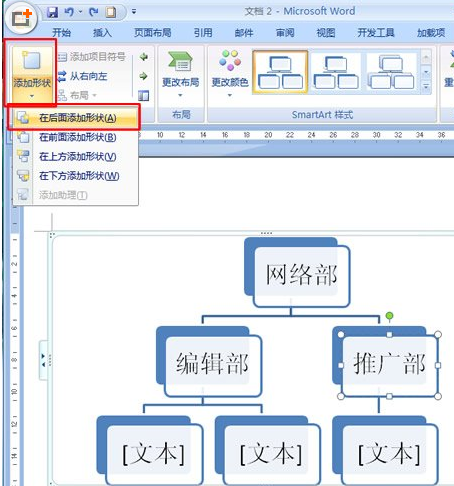 4.在文本框中输入文字后,发现还缺少文本框,可以根据需要在文本框前、后、上、下任意处添加图形文本框。选中一个图形文本框,进入“设计”选项卡,单击“添加形状”按钮,在弹出的下拉框中根据需要选择一种图形位置,这里选择“在后面添加形状”命令。