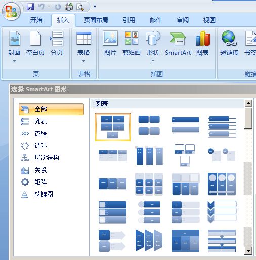 不知道你是哪个版本。按07的说吧,插入-SMARART调出图片中的窗口,选择你要的