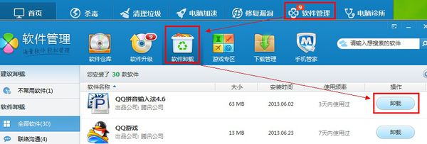 可以使用腾讯电脑管家的软件管理进行卸载,