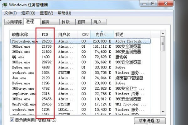 2、进入界面后,在进程里面显示“PID”这一项,在这即可查看各个应用程序的端口号。