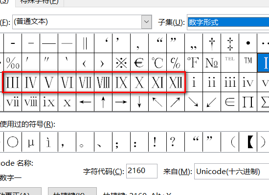 5、在“普通文本”下的“数字形式”子集中点击对应罗马数字即可自动插入。