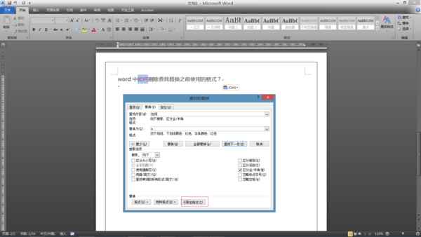 光标定位在“查找内容”或“替换为”右侧的输入框,单击“不限定格式”按钮,如图所示,参考一下。