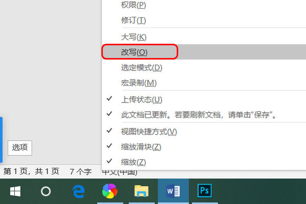 2.右键,在出现的选项里面找到“改写”,点击,如下图所示;
