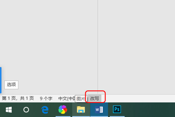1、打开word,在页面下边有一行不引人注意的窄条,但却反映了页面上很多信息,其中就有当前是“插入”还是“改写”状态。见下图: