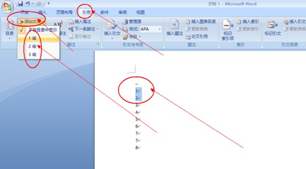 一、打开word文件,选择要生成目录的内容,选择引用菜单中的添加文字,设置成一级、二级或三级标题,如下图所示: