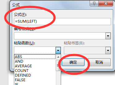 3.在弹出的窗口中,填写公式=SUM(LEFT),然后点击——确定;