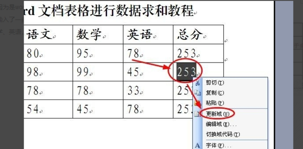 7、再次用鼠标选中其它没计算出来的总分单元格,点击鼠标右键,然后再点击更新域。