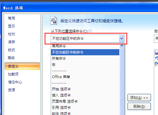 4、在中间从下列位置选择命令下拉框中选择【不在功能区中命令】