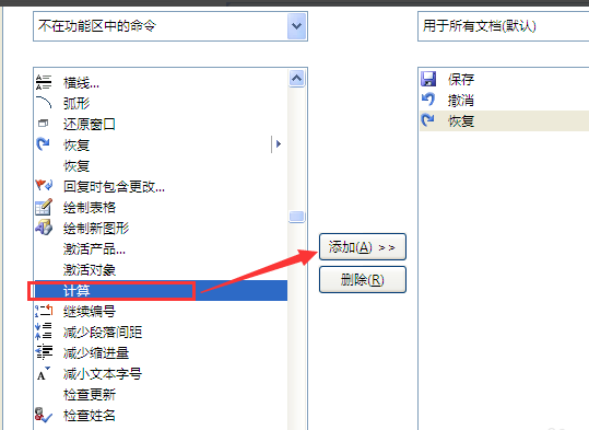 5、之后在下面的滚动列表,一直往下拉,找到其中有一个【计算】功能的选项,选中它点击中间的添加按钮,当【计算】功能从左边跑到右边之后,再点击右下角的确定按钮