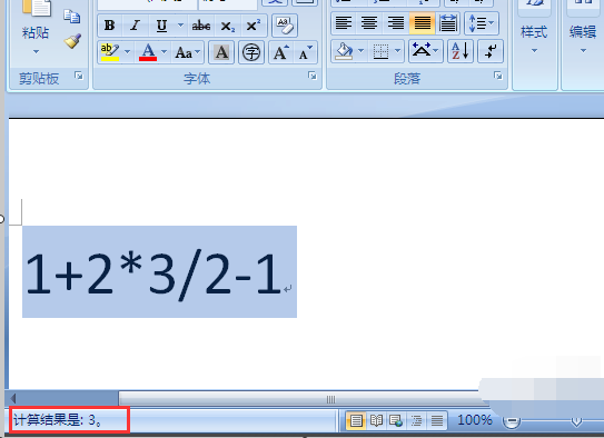 7、下面我在Word中随便输入一个运算演示:1+2*3/2-1,根据数学中的四则混合运算,结果应为:3,