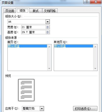 还有一种情况,也会出现Word打印不全的情况,那就是纸张设置错误,例如打印机里面装的是A4的纸张,然后Word中纸张设置是A3的,这样多出了的部分,当然不会显示出来,所以如果上面的方法都没能解决问题,请检查一下Word纸张设置是否与打印机中装的纸张一样。在【页面设置】【纸张】中查看和设置。