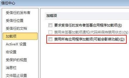 5、进入信任中心列表菜单,点击加载项勾选禁用所有应用程序加载项即可。