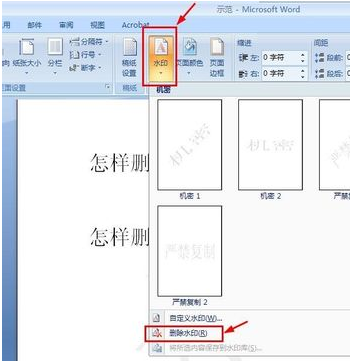 3、也可以直接在菜单栏的“页面布局”——“水印”——“删除水印”菜单,也可以去掉水印;