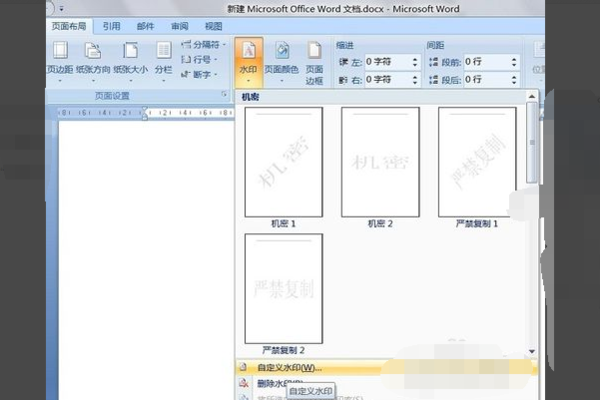 1、按照方法一的第1步和第2步选择“页面背景”选项卡中的“水印”,然后在下拉菜单中选择“自定义水印”,如下图所示。