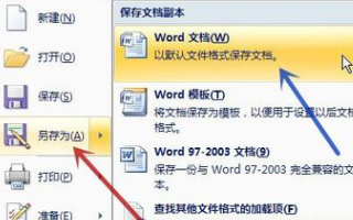 2、将鼠标指针移至“另存为”(图中红色箭头所指),在弹出的菜单中选取合适的文档类型,这里以存为“Word 文档”为例(图中蓝色箭头所指)
