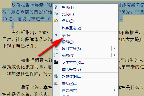 2.接着在word文档中选中需要设置的文字,单击鼠标右键,选择字体。