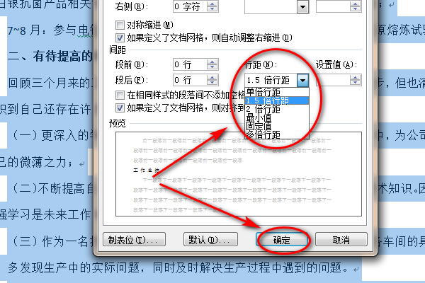 5、在缩进与间距设置界面选择合适的行距并点击下方的确定按钮,即完成了word文档的行距设置。设置后,整个word文档的行间距变成一样。
