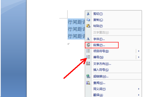 3、在需要更改行间距的段落上点击鼠标右键,弹出右键菜单,点击“段落”。