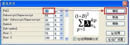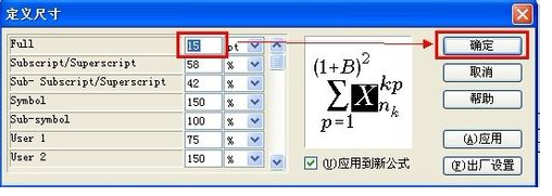 2、调出“Define Sizes”对话框,在“Full”后的输入框中要调整的字号大小。公式中其它的元素会自动进行相应的调整。点击“OK”,关闭对话框。
