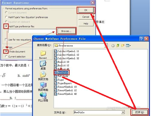 在“Format Equations”对话框选中中间的“MathType preference file”单选项,再选中下方“Range”项目中“Wholedocument”单选项,单击“Browse”按钮,找到我们保存好的那个NewStyle.eqp文件并双击。然后最后单击Ok: