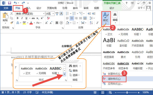 步骤四:双击页面的页眉部分,然后我们点击开始项,找到样式,如下图1所示,点击右下角箭头。然后如图2所示,清除格式就OK了